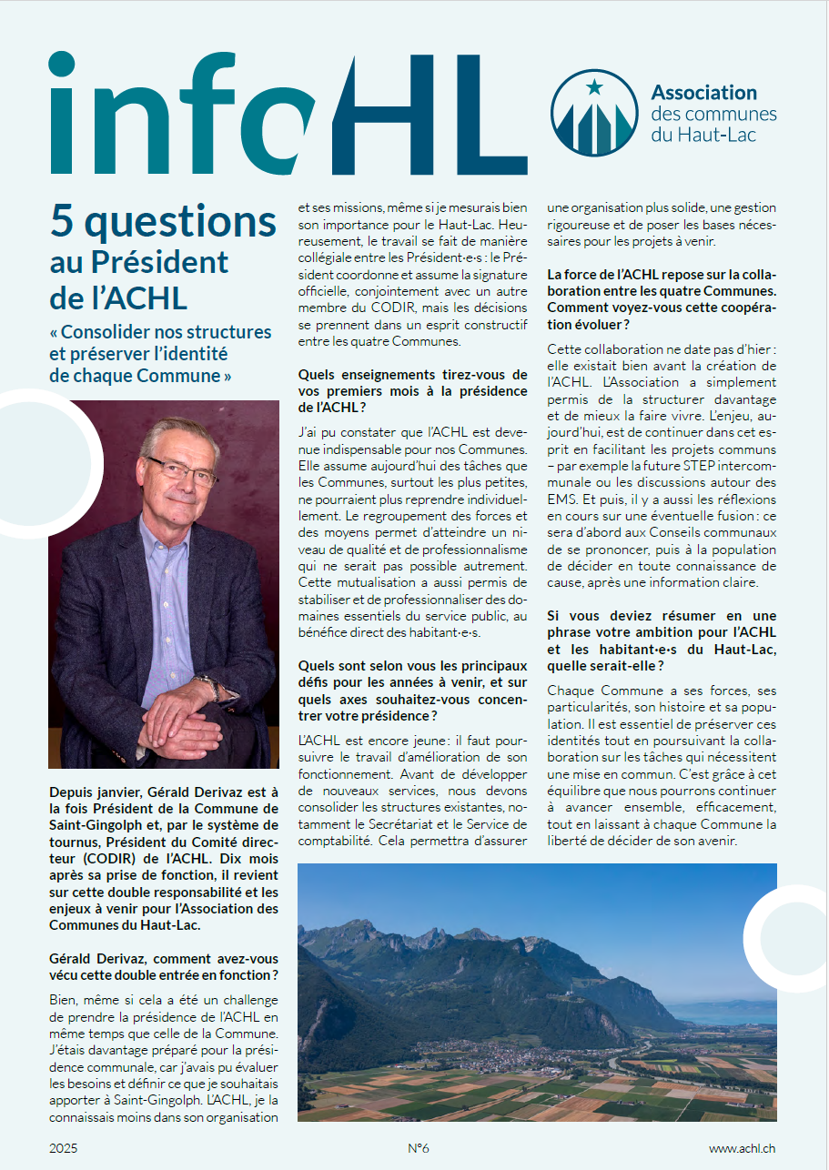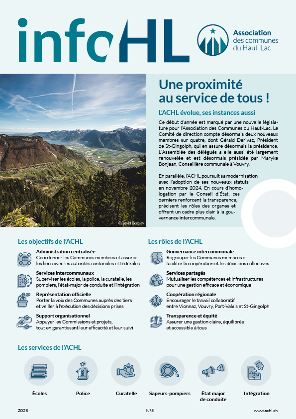 L’Association des communes du Haut-Lac (ACHL) regroupe Vionnaz, Vouvry, Port-Valais et St-Gingolph pour fournir des services intercommunaux coordonnés. Nous gérons les écoles, la police, les pompiers, les services de curatelle et l’intégration, tout en assurant une gouvernance transparente.